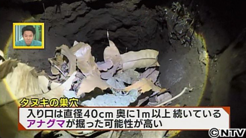 今、その巣穴は使われていないそうで、どんな場所か、見に行ってみました。藪をかき分け林をいくと、地面にぽっかりあいた穴。タヌキがいないことを確認した上で、カメラでのぞいてみました。深さは1メートル以上。おそらくアナグマが掘ったもので、タヌキがちゃっかり巣穴にしたようです。