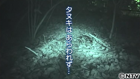 どうしても生でタヌキが見たい桝アナ。ため糞場の近くの木にカメラをしかけ、原田さんとモニタリング。日が暮れて観察スタートです。ただただ、モニターの中のため糞場をみつめひたすら待ちます。その後も、タヌキを待ち続けましたが気配もなく残念ながら生でタヌキを見るチャレンジ断念です。