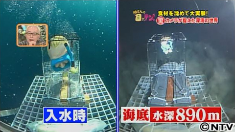 沈みはじめて15分後…水深890mに着底。海底についたとき、所さん人形は、元の大きさの5分の1以下になっていました。