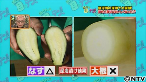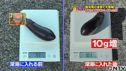 では、肝心の食材はどうなったのか!?なすは、見た目はさほど変わりませんが、深海に入れる前と比べると、海水を吸って10gも増えていました。