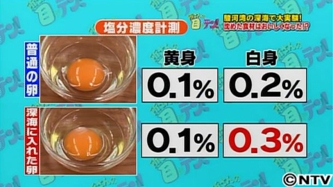 続いて、生卵は、たまごかけごはんに。醤油などの調味料は入れずに戴きます!すると…ほんのり塩気を感じました!では本当に塩分が入ったのか、普通の卵と深海に入れた卵で、黄身と白身、それぞれの塩分濃度を計測してみたところ…黄身は数値に違いはありませんでしたが、白身は、深海に入れたほうが、塩分濃度が上がっていたんです!
