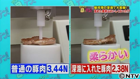 すると…全員が、深海に沈めた肉のほうが美味しいと答えました。柔らかく、ジューシーになったという人も!本当に柔らかくなったのでしょうか?ものの硬度を測る装置を使って、噛んだ時の固さを計測します。すると…普通の豚肉に比べ、深海に入れた豚肉のほうが硬さの数値が低く、本当に柔らかくなっていたんです!