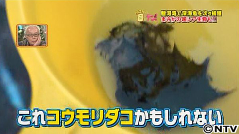 英語では、「バンパイアスクイッド」、学名で“地獄の吸血鬼イカ”!イカとタコの共通の祖先とされている生物です。分類は、コウモリダコ目(もく)で、現存するのは、この一種のみ。近い仲間が生きていたのは、中生代ジュラ紀、白亜紀とも言われていてまさに生きている化石です!これまでカリフォリニアや小笠原で撮影された映像はあるものの、実物が捕獲された例は、めったになく、貴重だとのこと!駿河湾の深海には…数多くの珍しい生き物が暮していました!