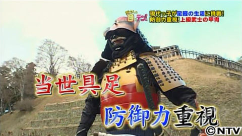 今回、都丸さんにはこの山城を舞台に、足軽の生活にチャレンジしてもらいます。まずは恒例の着替え!足軽との比較のため、最初に上級武士の格好に着替えます。上級武士が身につける、「当世具足」と呼ばれる甲冑は、とにかく防御力重視。