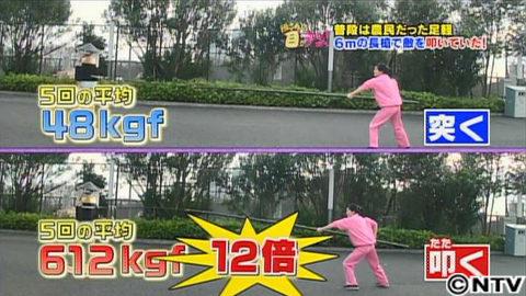 都丸さんも先生に教わって、再びチャレンジです。すると…なんとすぐに、標的を捉えることに成功しました。的を狙いやすいだけでなく、女性の力でも竹のしなりで衝撃がアップしたようです。そこで「突く」と「叩く」で衝撃力を計測してみることに。実験に協力してくれたのは、都丸さんと同じく、槍を初めて持つ一般女性。槍の先には特殊な機械を取り付け、槍が標的に当たった時の衝撃力を計測します。まず突いたときは、平均48kの衝撃力。続いて叩いたときは、なんと平均612kの衝撃力。 突いた時に比べ、叩くと12倍以上もの衝撃を与えられたんです。
