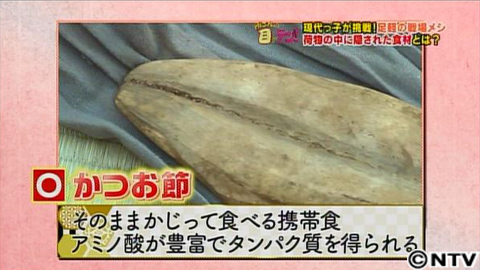 それでは、チャレンジスタート!まず手にしたのは、枕のような袋。中から出てきたのは…なんとカツオぶし!足軽はこれをそのままかじることで、戦場でも貴重なタンパク質を得ていたんです。