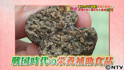 次に手にしたのは…兵粮袋という食料を入れるための袋。その中から…謎の黒い食べ物が。これは兵粮丸という戦場での携帯食。実はとっても、足軽にとって助かる食べもの。使われている材料は、きな粉やそば粉、クルミなど、栄養価の高い5種類の食材。それらに、はちみつと日本酒を加えて混ぜ合わせます。それを3cmほどの大きさに丸めて、1時間ほど蒸します。蒸しあがったら、一日、天日干しをして水分を飛ばせば完成です。1日に2個食べれば飢えをしのげたというほど腹持ちがよく、いわば現代の栄養補助食品のようなもの。続いて手にしたのは、巾着袋。こちらは干飯という保存食。