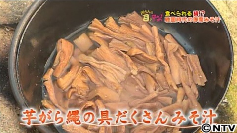 玄米を一度蒸してから天日干ししているので、炊かなくてもそのまま食べられるお米なんです。と、ここまでは3つの食材を順調に正解した都丸さんでしたが…最後の1つがどうしても見つからず、ギブアップ。実は4つ目の食材は…縄。芋がら縄といい、ズイキというサトイモの茎を味噌汁で煮しめ、乾燥させて縄状に編んだもの。普段は縄として使用し、非常時には鍋に入れるだけで、味噌汁になり、栄養と塩分を補給できるんです。
