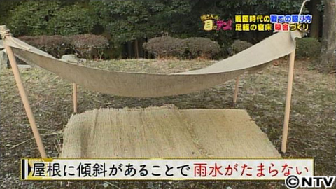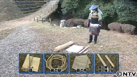 続いては、戦国時代の足軽の眠り方に挑戦!小和田先生によると、行軍中や戦場で、足軽は幕舎と呼ばれる、テントのようなものを立てて野宿をしていたそうですが、どんなものなのか?そこで幕舎作りに都丸さんが挑戦です!都丸さんには、4つの道具をすべて使って、足軽のテント「幕舎」を作ってもらいます。