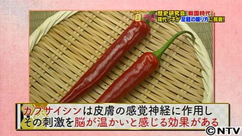 戦国時代の夜も更け…恒例になっているのでとりあえずやってみることにした「眠り方チャレンジ」。しかし…都丸さん、寒くて寝られない様子。そこで先生が、足軽が実践していた寒さ対策を教えてくれました。当時の足軽の生活について書かれた貴重な記録「雑兵物語」。ここには「唐辛子をすりつぶして尻から足のつま先まで塗っておくと、凍えないで済む」と書かれています。さすがに痛そうなので、今回は切った唐辛子を布で包み、つま先に入れました。トウガラシに含まれるカプサイシンは、皮膚の感覚神経に直接作用し、刺激を与えるため、脳が温かいと勘違いし、寒さを感じにくくなる効果があるそうです。