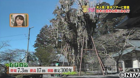 高橋さんによると、1000年生きてきた割にはすごい元気で、他の杉と比べても明らかに大きさが違うといいます。では、幹周りはどれだけ太いのか?地上1.3mの太さを測ってみると…幹の太さは10m32cm。高橋さん曰く、10mを超えれば超一級のスギだといいます。さらに境内には他にも巨木が。それは、樹齢300年以上と言われるイチョウ。