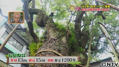そしていよいよ、栄えある第一位は!?高橋さんによると、樹形とか樹勢、樹齢とか太さとかを総合して日本ナンバー1の巨木。向かったのは、熊本県北迫町。地元で「寂心さん」と呼ばれ、親しまれてきたクスノキの巨木です。確かに美しい樹形と有り余る樹勢は、まさに圧巻の一言。さらに…枝や葉が茂る最上部の「樹冠」の大きさ。なんと直径50mもあるんだとか。そんなクスノキは、地元の方にとっては“心の拠り所”。写真映えする巨木第1位は、地元の守り神・寂心さんのクスノキでした。