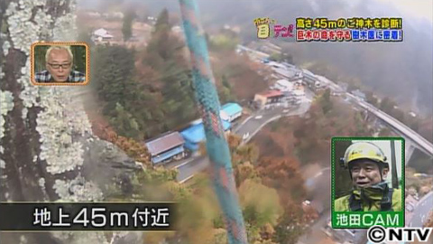 それではさっそく調査開始。裕太さんは、高所作業車に乗って、樹木医の作業をリポート。高さ15mあたりにやって来た裕太さん。しかし、ここからさらに登るといいます。じつは、樹木全体の状態を診断するため、とにかく頂上まで登る必要があるんです。その頃、先に登った池田さんは頂上付近に到着。見晴らしは良いですが…それはかなりの危険が伴う作業。