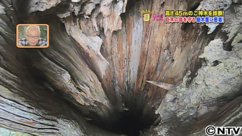 さらにその下、樹の裏側に回ってみると…驚きの光景が!それは…大人2人がすっぽり入るほどの大きな空洞。その深さを測ってみると…11m。どうやら空洞は、根元近くまで広がっているようです。