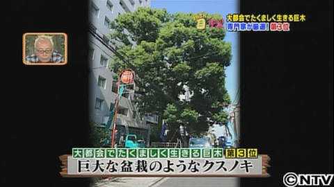 まず第3位。後藤さんによると、とても生育が旺盛で、樹勢、樹形も美しい。中々そういう状態で残っている巨木は都会の中では珍しいので、そこが特徴的だといいます。東京ドームにほど近い文京区・本郷。そこに…ビルの合間に、巨木を発見!あの司馬遼太郎をして「一樹で森を思わせる」と感嘆させた「本郷の大クス」です。実はこのクスノキ、毎年秋に大規模な剪定作業を行っているんです。適度な剪定を行うことで、樹の形と生育を維持する。その姿はまさに…巨大な盆栽のようです。