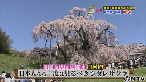 まず第3位は…高橋さんによると、もう言葉が出ないぐらい美しい、日本人に生まれたからには一度は見ておくべき巨木。そこは…福島県・三春町。樹齢1000年!国の天然記念物「三春滝桜」です。シダレザクラとしては日本最大。咲き誇る姿は、まるで滝が流れ落ちるかのよう。日本人なら一度は見るべき桜の巨木です。
