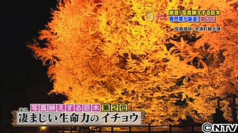 続いて、第2位は?高橋さんによると、その生命力の凄まじさ。もう樹を通り越して壁かなんか岩のような感じだといいます。青森県・深浦町。目の前に立ちはだかるのは一本のイチョウの幹。幹周りは驚異の22m!写真映えするのは11月の紅葉の時期。ライトアップされた優美な姿もまた、一興です。
