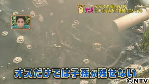間口が狭く奥行きがある。細長い建物を指す言葉として使われるウナギの寝床。実際、ウナギはこの塩ビ管のように、体が入れられる細長―い場所を寝床にします。また、ドジョウと同じように泥や砂の中に潜る性質も。身体がなにかに密着してないと安心できないんです。しかし…ウナギは寝床がないと寝ないで動き続けてしまうんです。一生懸命運動するので、それだけエネルギーが必要で餌もたくさん食べます。これがいわゆる養殖のウナギの状態で、一種の異常な行動。早く大きくなるように環境に適応したウナギです。かがくの里のような自然に近い状態で大きくなると、養殖条件下でみんながオス化してしまうような異常なことは起こらないのではないかなと千葉先生は考えてています。