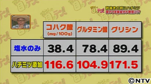 ブドウ糖をたくさん含んでいる、ハチミツでも同じ効果が得られるかもしれないということで実験!塩水1Lに対して、1gを目安にはちみつを添加します。ひと晩、8時間砂抜きして、貝の成分に詳しい品川教授に旨み成分の分析をしてもらいました。食べる状態と同じように蒸し焼きにし、火を通します。アサリの身だけを取り出し成分を分析したところ、塩水だけの砂抜きに比べて、コハク酸の量が3倍以上アップ!さらに、旨味に関わるグルタミン酸と甘みに関わるグリシンの量も大幅に増加していたんです!