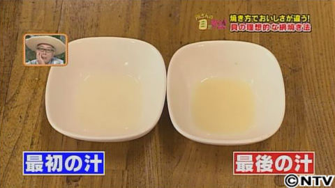 身が下に来るように焼くにはどうしたらいいのか?鳥羽先生と露久保先生に、この問題をぶつけてみると「貝は、貝殻に両方の力でくっついてるから、加熱することでたんぱく質が熱変性を起こして貝殻から離れる。下から熱しているとどうしても下からはなれ、上が剥がれないからみんな上にくっついちゃう」。なんと貝に裏表があるわけではなかったんです。でも、せっかくの美味しい汁がこぼれてしまうのはもったいない!しかし、両専門家によると「貝から最初に出てくる水は、ほとんどが海水。その後もう一回加熱した時にまた、グツグツとエキスが出てきて、そちらの方に貝の旨み成分がギッシリ詰まってる」とのころ。貝の旨味を凝縮したものを味わうためにも最初に出てきた海水は流してしまって問題ないのだそう。とは言われても、やはり勿体無い。そこで、最初に出る汁と最後に出る汁を比較してみると…最初の汁はほぼ海水。最後の汁は旨味たっぷりでした。
