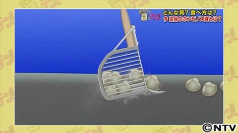 スーパーなどでも、最近は常連の顔となっている「ホンビノス貝」。漁が行われるのは主に千葉県船橋の海。漁の道具は、棒の先にカゴがついた鋤簾(じょれん)。こちらを海の中へ。水深2mほどの場所で、鋤簾の先を海底に刺してテコの原理でかき上げながら貝を集めていくのです。