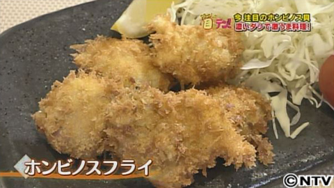 続いて、身の大きさを生かした料理。アサリと比べて火を通した時に縮みにくいのがホンビノス貝の特徴。茹でる前と比較すると、確かにホンビノスのほうが身がしっかり残っていました。まずはホンビノスを茹でて、身を取り出します。これに薄力粉とつなぎの卵とパン粉をつけて「ホンビノスフライ」。高価なハマグリでは躊躇してしまう、ホンビノスだからチャレンジできる一品!