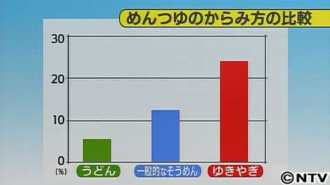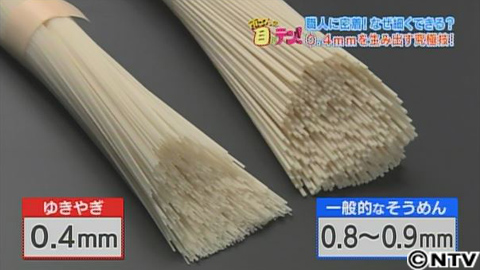 山田先生は、細い麺にすると単位重量あたりの表面積が大きくなるので、0,4mmの「ゆきやぎ」は断トツでめんつゆの絡みが多いと解説。