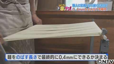 その後、くっついたそうめんを2本の棒で分ける「はしわけ」の作業をスタッフが体験させてもらうと…麺同士がくっつき、うまく開けません。そうめんに使われる強力粉は、くっつく力が強く、分けるのが難しいのです。分けてのばしたそうめんは、この時点で1mmの細さに。