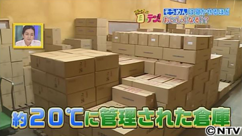 しかし山田先生によると、そうめんは時間が経つほどおいしいと言われているのだとか。その驚きの理由を探るために、およそ400年前から伝統の手延べ製法でそうめんを作っている、瀬戸内海の小豆島に。この地で35年、そうめんを作り続けている中武さんの倉庫に案内して頂きました。倉庫の中は1年を通しておよそ20℃に管理され、たくさんのそうめんが。