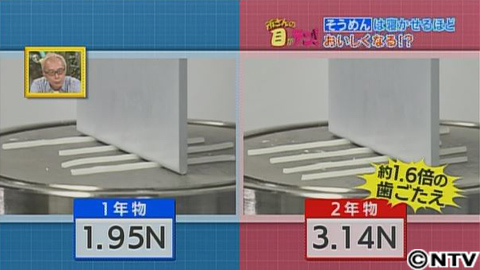 製造から2年目を迎えたものを「古物(ひねもの)」、3年目のものは「大古物(おおひねもの)」と呼び、いずれも特級品として高い値段で売られているのです。では、私たちがよく食べている1年ものと割高な2年ものを食べ比べてみると…歯ごたえが全然違います!さらに、それぞれの抵抗力を科学的に計測してみると、1年ものの麺が切れるときの抵抗力が1.95Nだったのに対し、2年ものはおよそ1.6倍となる3.14Nに。