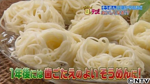 山田先生は、その秘密が油にあると言います。そうめん作りでは、麺同士がくっつかないように表面に油を塗ります。こうすることで、梅雨の時期を過ぎると、小麦粉の中の酵素に活性が現れ、油と小麦粉のたんぱく質が結合して食感がよくなるのです。実はこの現象は、家庭にある“余ったそうめん”でも起きていているのです。今年食べきれなくても、封を閉じたまま直射日光を避けて、冷蔵庫などで保存すれば、翌年にはより歯ごたえの増した美味しいそうめんになっているのです!