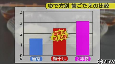 それぞれの麺の歯ごたえを計測してみると、普通のお湯で茹でたものは1.55Nだったのに対し、梅干しで茹でたものは2.47N。梅干しを入れるだけで歯ごたえがおよそ1.6倍になるという結果に。