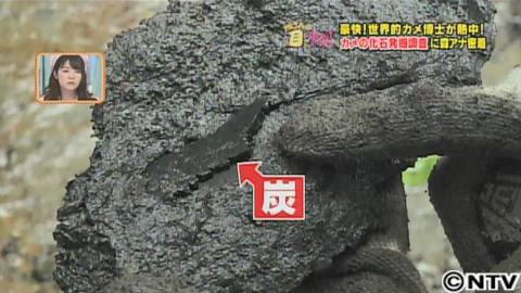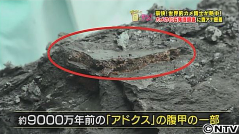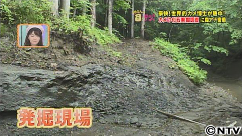 しかし目指すは、琥珀よりカメ!森アナも必死に掘り続けますが、なかなか見つかりません。作業開始から3時間、入社22年目の森アナの腰にもダメージが蓄積されていきます。そこで、近くの博物館のスタッフに手伝ってもらうことに!発掘から5時間が経過・・・すると、平山先生が何かを発見したようです!それは、新種と思われるカメの甲羅。9000万年前の「アドクス」という種類のカメだと言います。