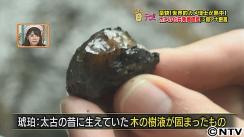 さらにアイスピックを使って、より細かく砕いていくと、森アナが何かを発見!先生に聞くと、植物の化石だそう。やはり、カメの化石は簡単には見つかりません。さらに発掘を進めていくと、今度は変わった石のようなものを発見!こちらは、9000万年前に生えていた木の樹液が固まった「琥珀」です。