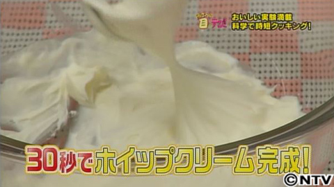 普通、手作業で生クリームからホイップクリームを作ろうとすると出来上がりまでおよそ5分かかり、結構疲れます。しかし、金子さんによると、混ぜる前にヒミツの液体を入れておくだけで本当に、30秒で、ホイップクリームができました!