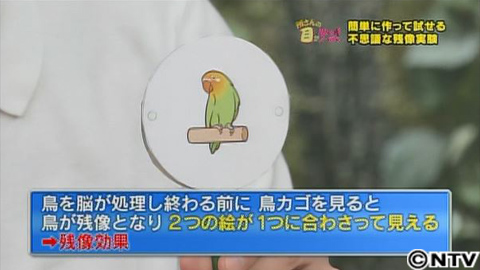 まず、須田さんが取り出したのは、表には鳥、裏面には鳥カゴが書いてある道具。両手で挟み込み、前後に回転するように動すと、鳥が鳥籠の中にいるように見えてきます。これは、残像の一種で、鳥と鳥籠は同時には見えていないはずなのに、高速で動くことによって、人間の目と脳では同時に見えているように感じてしまうんです。