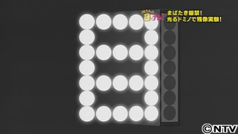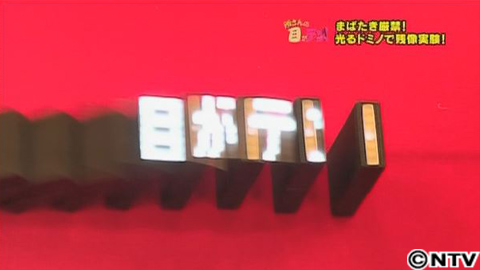 さらに須田さんが、見せてくれるのは、光の動きによる残像。その実験に使うのが、小さいドミノです。並べているのは、須田さんが開発したオリジナルのドミノ。実は、驚きの仕掛けが隠されています。最後の5つだけ違うのですが、注目して見ていると、一瞬、「目がテン!」の文字が浮かび上がりました!