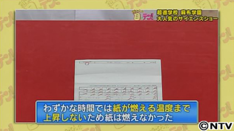 1つ目の実験。炎が激しく上がっているのに、どうして紙は燃えなかったのでしょうか?紙の上に置いていたのは、非常に燃えやすい薬品。激しく炎が上がりますが、すぐに消えるのが特徴。この短い時間で、紙の温度は上がらず、燃えることはなかったんです。