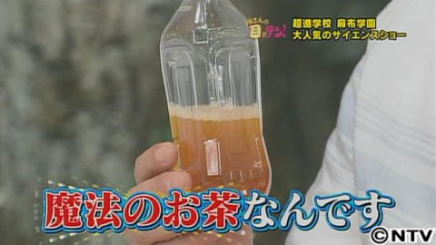 最後の実験は、お茶を使った実験。レモンティーが、シェイク!シェイク!シェイク!と振るだけで、ストレートティー、さらには緑茶と次々と色がかわってしまいました。実はこのお茶、何に変えても、すぐにレモンティーに戻っちゃう魔法のお茶なんです。