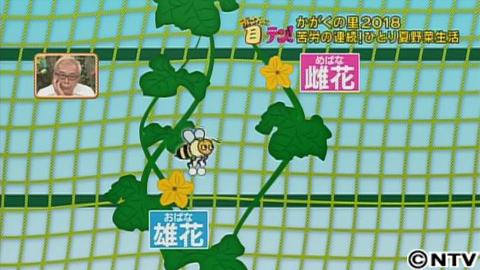 そして翌日、畑に作物を見に行くと、しっかりと水やりをしたかいもあり、小さなナスやトマトの実が、たくさん出来ていました!そして、初日にカラスにやられたスイカも順調に実を膨らましています。阿部さんが毎日いるおかげか、カラスも来なくなったようです。しかし、キュウリはというと、花は咲くものの肝心の実の部分が見当たりません。「花から実がなる」と聞いていた阿部さんも不安そう。そこで、高橋先生に見てもらうと…花の根元にわずかに膨らんだキュウリの実が見つかりました。キュウリは、1つの株に雄花と雌花の両方が咲きます。雄花が花粉をつけ、それをミツバチなどの虫が雌花に運ぶことで受粉し、雌花の根元が膨らんで実になるのです。