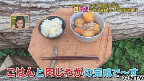 そこで、水場でバケツに水を汲み、畑まで運んでじょうろに移して水やりをすることに。1度の水やりで10往復も!これは、夏野菜で一番大事な作業。気温の下がる夕方にも再び10往復。ようやく作業が終了すると、里で採れたものを使って自炊をします。メニューは、ジャガイモの味噌汁とトウモロコシごはん。かなりシンプルですが、味は抜群!しっかり働くと、ご飯もより一層美味しく感じます。