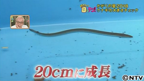 2か月前の稚魚の時と比べると、かなり大きくなっています。オスかメスかが分かるのは、20センチから30センチになってから、と言われています。そこで麻酔をかけ、大きさを測ってみると…20.5センチ!ギリギリ超えている大きさです。しかし、性別を確認するには、お腹を開いて生殖腺をチェックする必要があります。千葉先生も迷いましたが、ようやく捕れた一匹なので、今回は性別の確認は見送ることに。しかし放流から2か月、10センチだったうなぎは、なんと倍の20センチまで大きくなっていたんです!