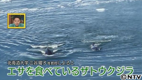 落ち込む金丸さんを元気づけようとディレクターが誘ったのが、やっぱり世界遺産。世界遺産も3回目、もういいだろうとテンションだだ下がりになったその時、嬉しい出会いが!クジラのペアです。専門家の北海道大学、三谷先生によると餌を食べている最中のザトウクジラだそうです。