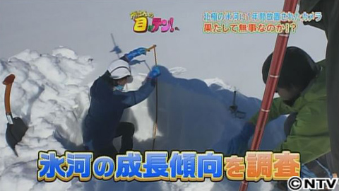 8月3日。真夏の北極は大雪。所さん人形に雪が降り積もります。その後、積もった雪は溶け続けて、氷河の表面が顔を出します。完全に凍ってツルッとしています。これが氷河の表面。この場所で、氷河の厚みは100m。