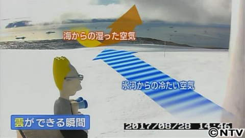 つづいて注目するのは海。海から白いものが沸き上がっていますが、これはまさに雲が誕生する瞬間。氷河の冷たい空気と海からの湿った空気がぶつかって、海の上で雲がどんどんできるそうで、この雲が飛行機キャンセルが多い原因なんです。