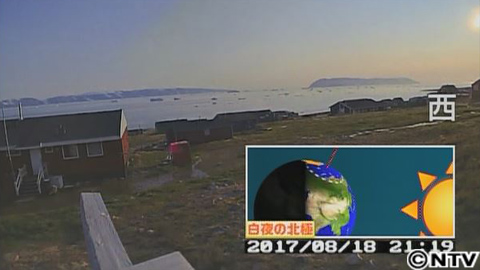 撮影スタートは2017年7月21日。奥に見えるのは海で、その奥には入り江の反対側が映っています。24時間常に30分に一度、撮影してるのですが、不思議な点が。実は、夜がこないんです。この時、北極は夜がこない白夜という時期で、太陽は沈まなかったんです。