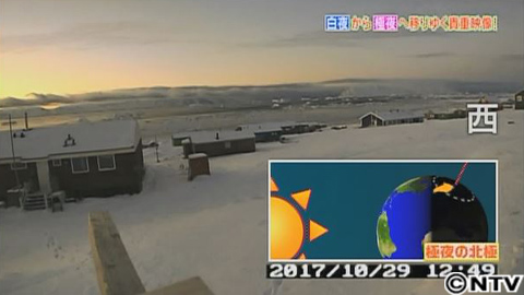 計算上は、8月23日から夜がきますが、最初のうちは太陽が一瞬しか沈まないので、夜になった感じがあまりよくわかりません。白夜が終わって、8月27日に初めて街灯が点きますがすぐ消えてしまいます。そして9月になると、町の方にも雪が降り始めます。だんだん夜の時間が伸びているのがわかります。定点カメラにも、太陽が西の空に沈むのが映るようになりました。10月に向けて、どんどん夜の時間が長くなっていきます。そして、太陽は地平線すれすれを移動して、沈むようになりました。だんだん、申し訳程度しか太陽が地平線の上に出なくなってきました。