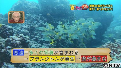 ダイビングをしたのは、サンタ・クルス島の北、ノースセイモア島の南に広がる海です。前々回の放送で上陸したノースセイモア島では、野生で暮らす海鳥たちの様々な生態が見られました。実は、この島の周辺の海は人気のダイビングスポット。ガラパゴスの海にはどんな世界が広がっているのでしょうか?いきなり出会ったのは、魚の大群!ガラパゴス諸島のまわりには、寒流と呼ばれる冷たい海流が流れています。この寒流には、豊かな栄養が含まれているため、プランクトンがたくさん発生します。そのプランクトンを食べに多くの魚が集まってくるのです。