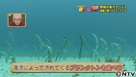 続いて現れたのは、ガラパゴスガーデンイールの大群。目がテンでも取り上げたことがあるチンアナゴの仲間です。チンアナゴは、体長30センチほどで、砂の中に隠れる変わった習性を持っています。野生のガーデンイールは警戒心が強く、近づくと砂の中に隠れてしまうため海底にカメラを置いて撮影してみます。すると…にょきにょきと砂の中から顔を出しました!よく見ると不思議なことに、みな同じ方向を向いています。実は、海流によって流れてくるプランクトンを食べているため、流れに逆らう方向を向いているのです。