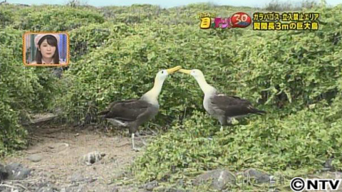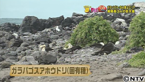 翼を広げると3メートルにもなるガラパゴスアホウドリ。離陸には助走が必要ですが、一度風に乗ってしまえば、長距離を飛ぶことができます。なんと、1200キロ以上離れた南米大陸沿岸まで餌を獲りに行ったという研究報告もあるのです。すると、アホウドリが謎の行動を始めました!オスとメスが、くちばしを激しくぶつけ合っています。これは、つがいになった2匹が絆を確かめるためにやる行動だと推測されています。